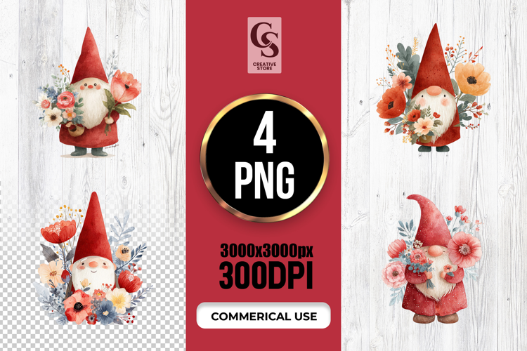 4 Watercolor Floral Gnome Holding Bouquet Clipart PNG Files Perfect for Greeting Cards, Invitations, Junk Journal, Party Decor, Scrapbooking and many other craft projects.