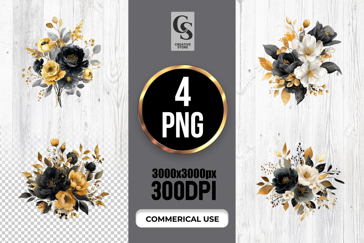 4 Black Gold Floral Watercolor Clipart Sublimation PNG Files Perfect for Greeting Cards, Invitations, Junk Journal, Party Decor, Scrapbooking and many other craft projects.