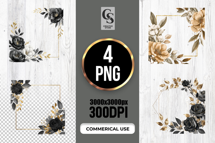 4 Black Gold Floral Frame Clipart Sublimation PNG Files Perfect for Greeting Cards, Invitations, Junk Journal, Party Decor, Scrapbooking and many other craft projects.