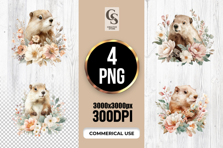4 Watercolor Marmot Floral Portrait Clipart Sublimation PNG Files Perfect for Greeting Cards, Invitations, Junk Journal, Party Decor, Scrapbooking and many other craft projects.