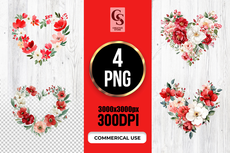 4 Red Floral Heart Watercolor Clipart Sublimation PNG Files Perfect for Greeting Cards, Invitations, Junk Journal, Party Decor, Scrapbooking and many other craft projects.