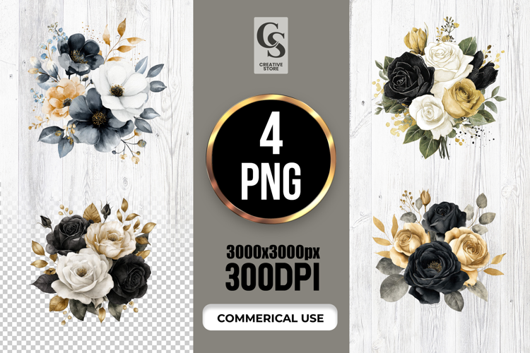 4 Black Gold Floral Watercolor Clipart Sublimation PNG Files Perfect for Greeting Cards, Invitations, Junk Journal, Party Decor, Scrapbooking and many other craft projects.