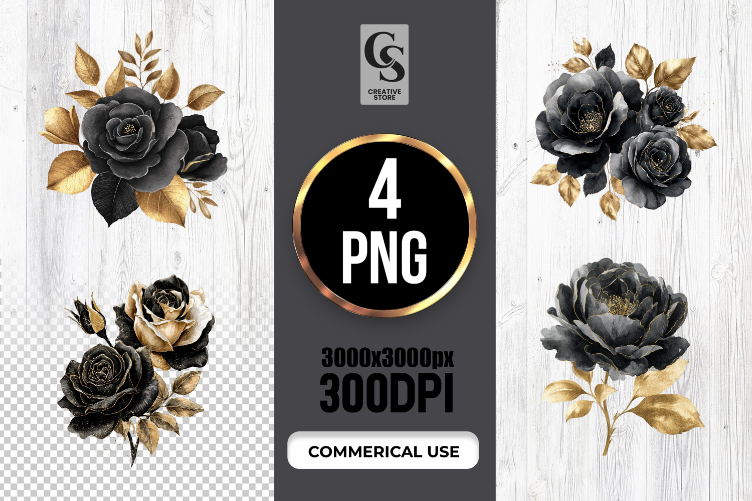 4 Black Gold Rose Watercolor Clipart Sublimation PNG Files Perfect for Greeting Cards, Invitations, Junk Journal, Party Decor, Scrapbooking and many other craft projects.