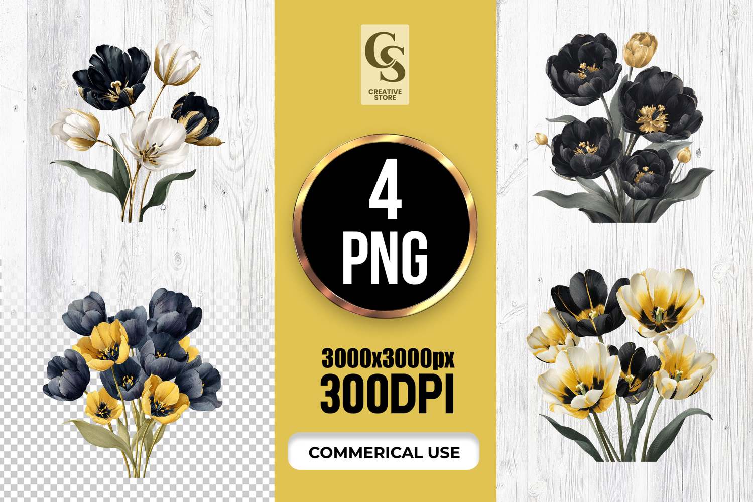 4 Black Gold Tulip Watercolor Clipart Sublimation PNG Files Perfect for Greeting Cards, Invitations, Junk Journal, Party Decor, Scrapbooking and many other craft projects.