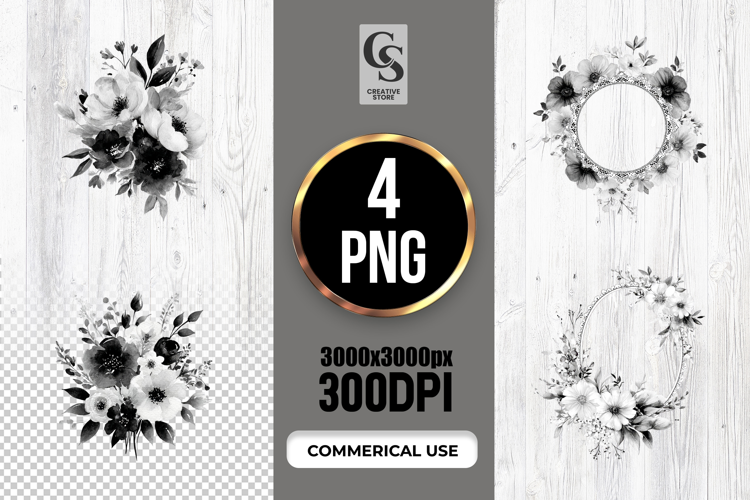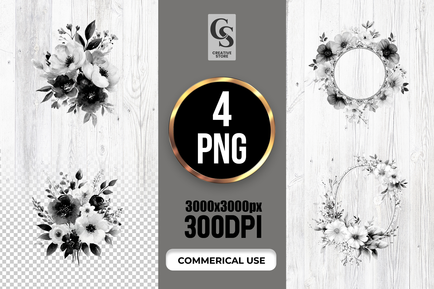 4 Black White Floral Oval Frame Clipart Sublimation PNG Files Perfect for Greeting Cards, Invitations, Junk Journal, Party Decor, Scrapbooking and many other craft projects.