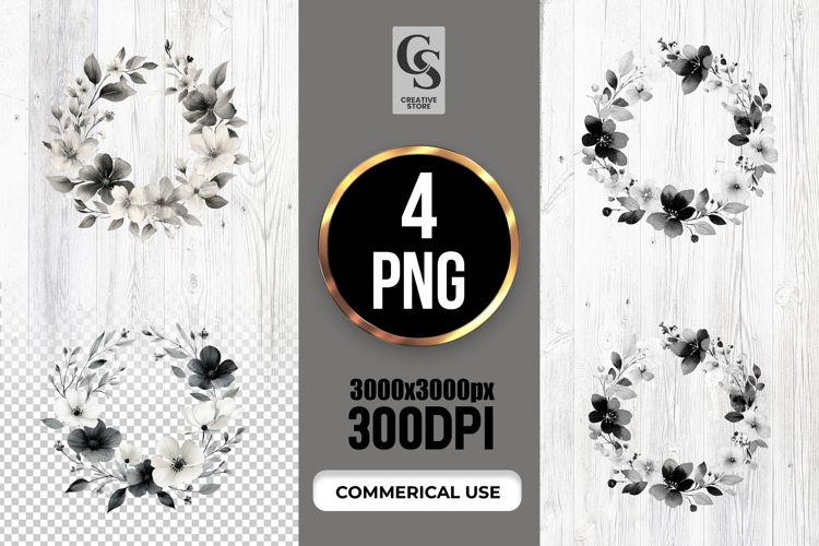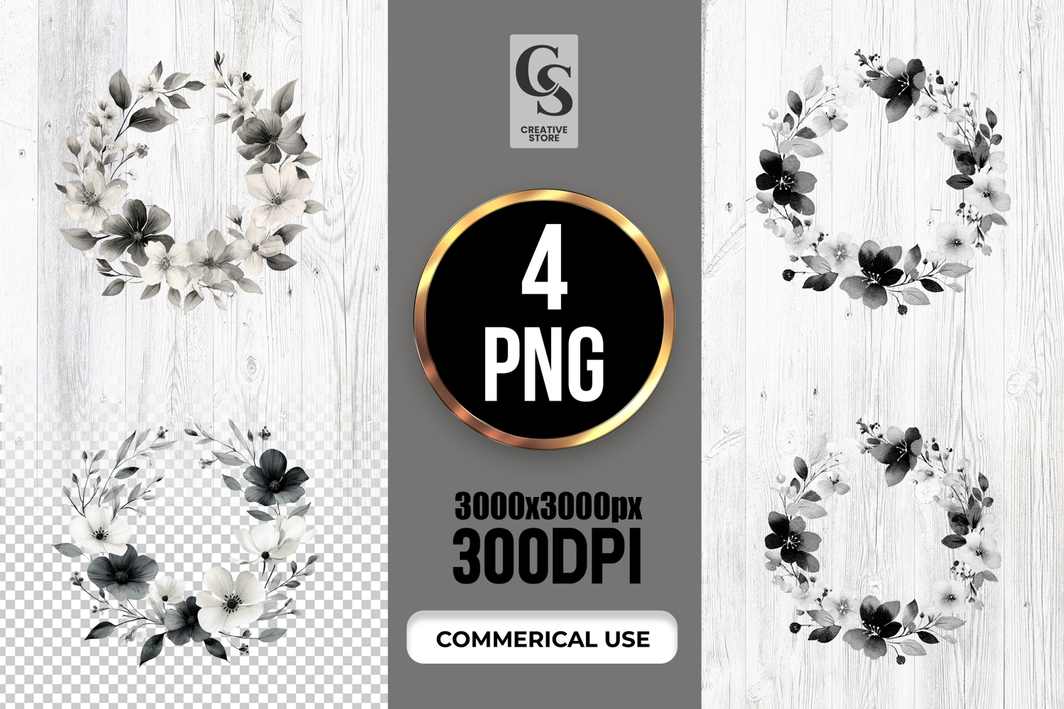 4 Black White Floral Circle Wreath Watercolor Clipart PNG Files Perfect for Greeting Cards, Invitations, Junk Journal, Party Decor, Scrapbooking and many other craft projects.