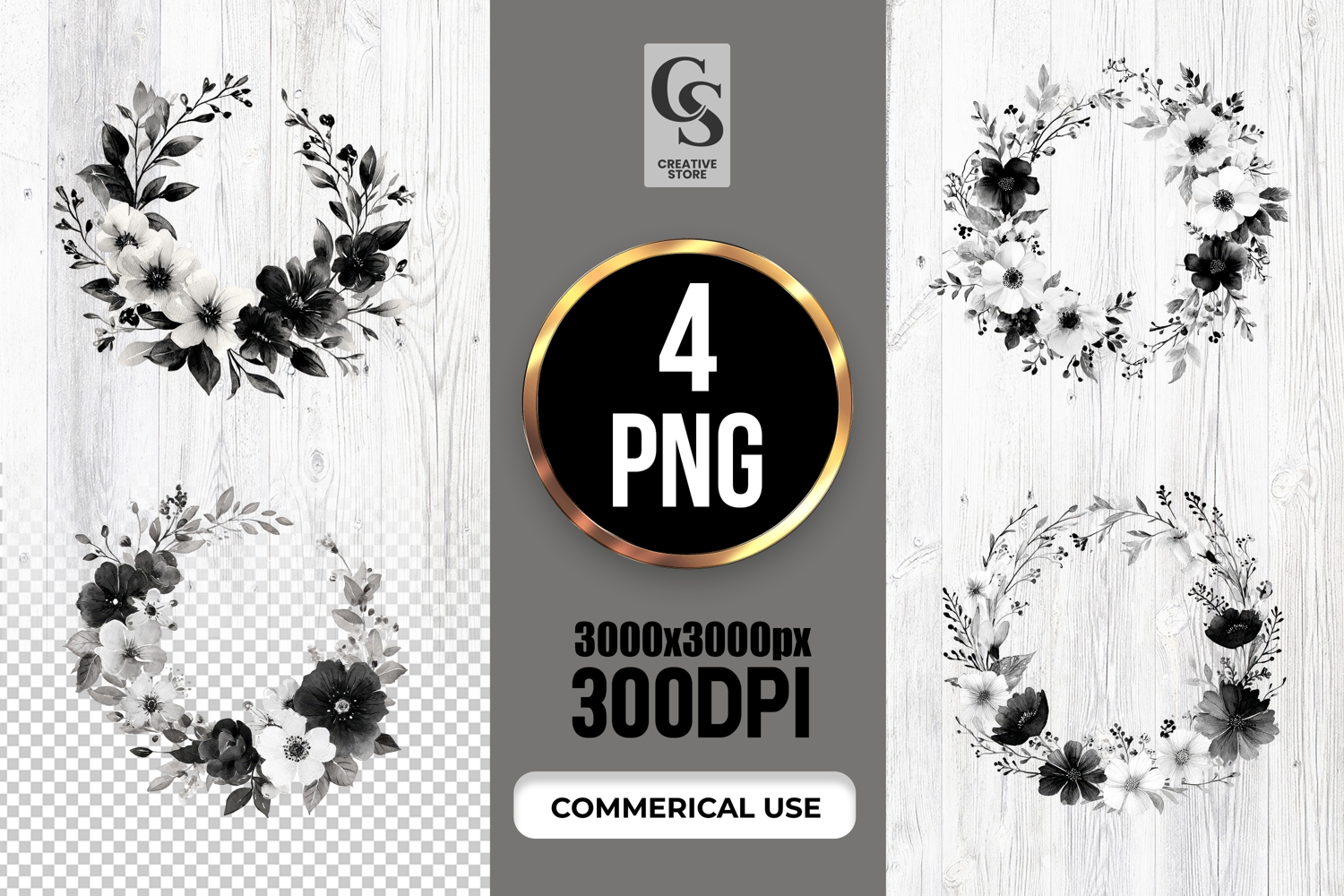 4 Black White Floral Half Wreath Watercolor Clipart PNG Files Perfect for Greeting Cards, Invitations, Junk Journal, Party Decor, Scrapbooking and many other craft projects.