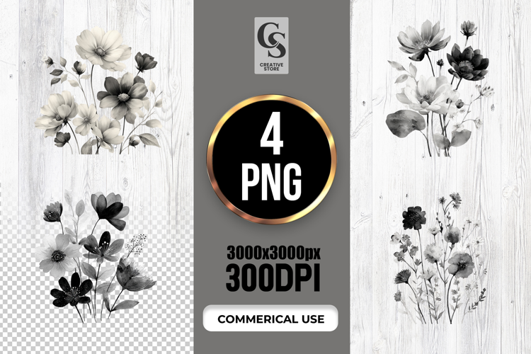 4 Black White Wildflower Watercolor Clipart Sublimation PNG Files Perfect for Greeting Cards, Invitations, Junk Journal, Party Decor, Scrapbooking and many other craft projects.