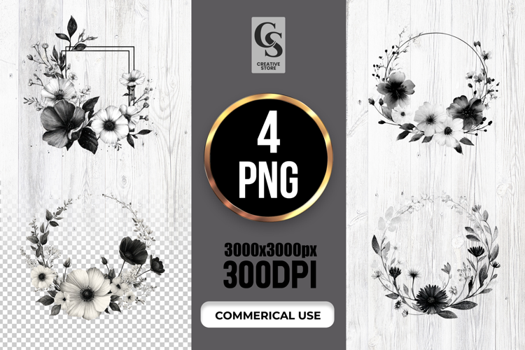4 Monochrome Floral Wreath Frame Clipart Sublimation PNG Files Perfect for Greeting Cards, Invitations, Junk Journal, Party Decor, Scrapbooking and many other craft projects.