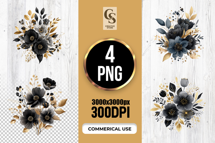 4 Black Gold Floral Bouquet Clipart Sublimation PNG Files Perfect for Greeting Cards, Invitations, Junk Journal, Party Decor, Scrapbooking and many other craft projects.