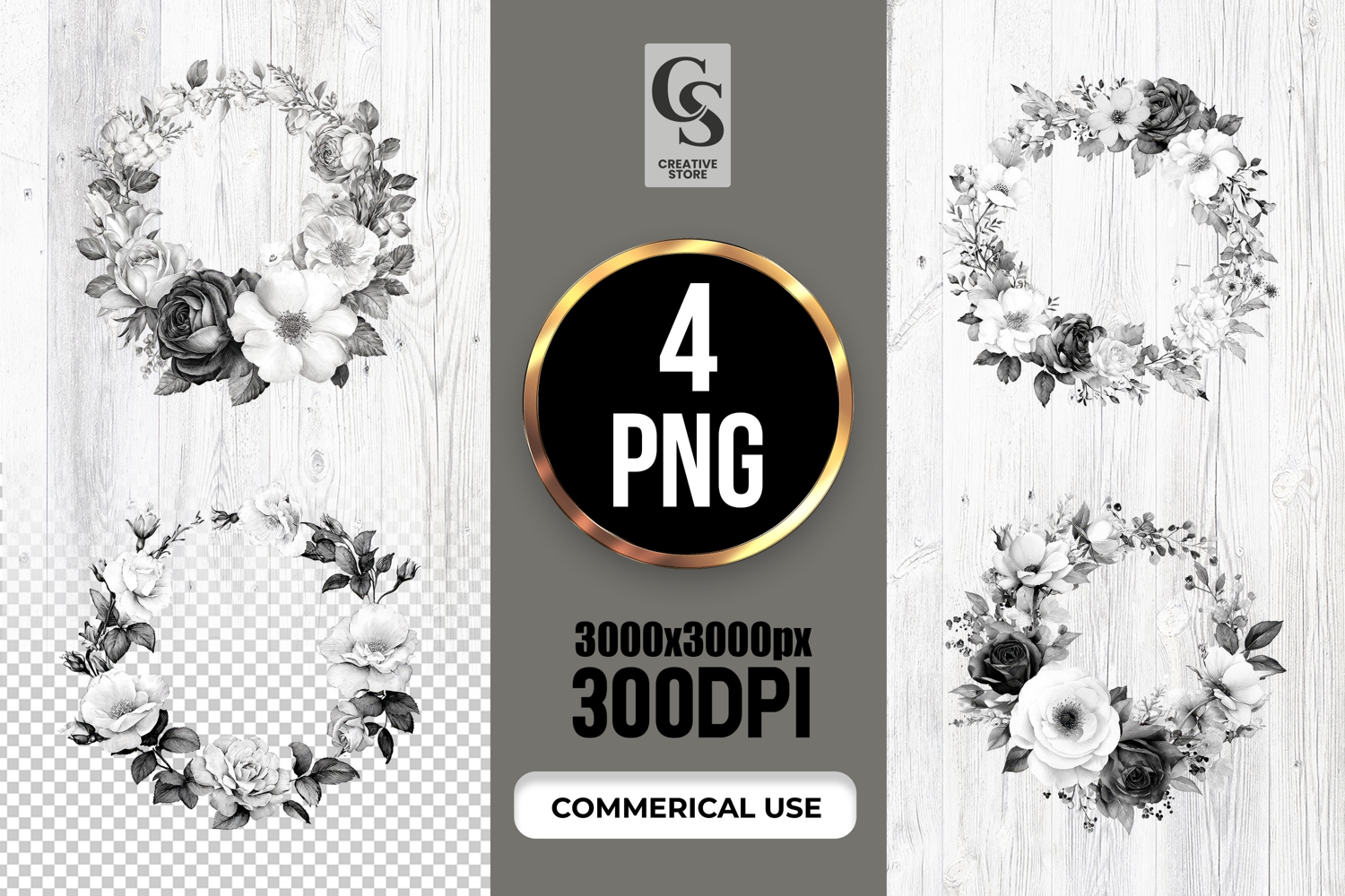 4 Black White Floral Wreath Clipart Sublimation PNG Files Perfect for Greeting Cards, Invitations, Junk Journal, Party Decor, Scrapbooking and many other craft projects.