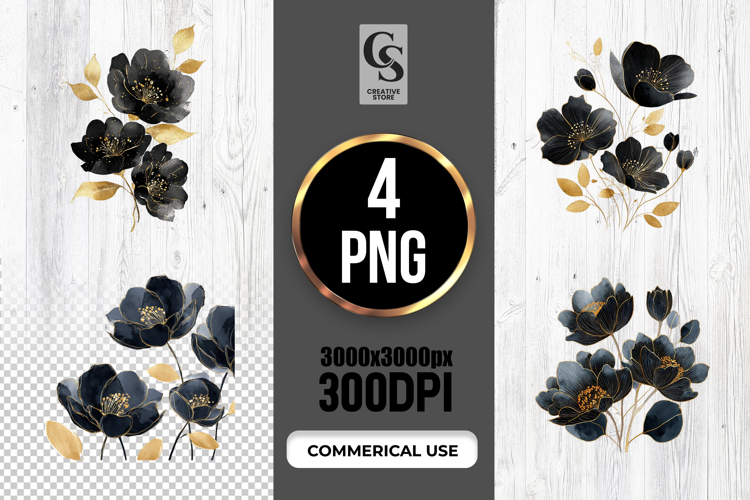 4 Black Gold Floral Flowers Clipart Sublimation PNG Files Perfect for Greeting Cards, Invitations, Junk Journal, Party Decor, Scrapbooking and many other craft projects.