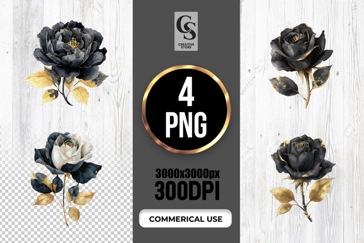4 Black Gold Rose Flower Clipart Sublimation PNG Files Perfect for Greeting Cards, Invitations, Junk Journal, Party Decor, Scrapbooking and many other craft projects.