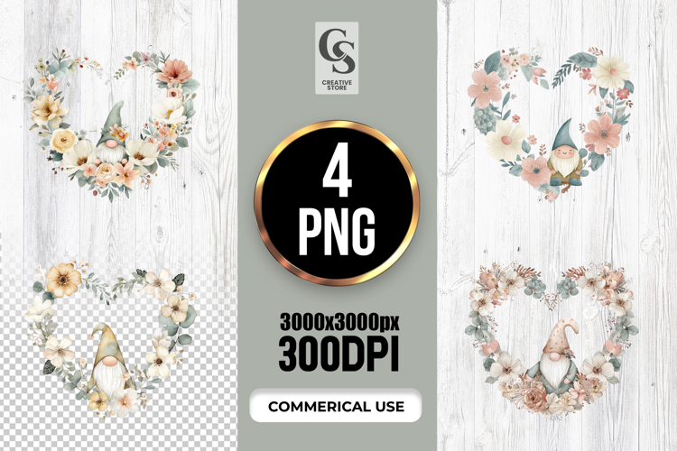 4 Floral Gnome Wreath Watercolor Clipart Sublimation PNG  Files Perfect for Greeting Cards, Invitations, Junk Journal, Party Decor, Scrapbooking and many other craft projects.