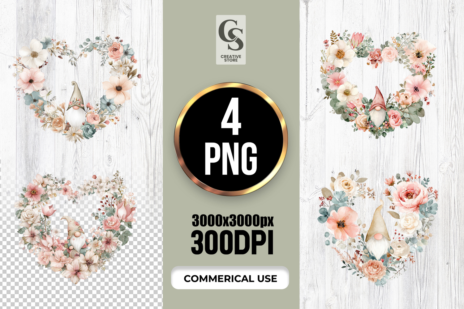 4 Pastel Floral Gnome Wreath Watercolor Clipart PNG  Files Perfect for Greeting Cards, Invitations, Junk Journal, Party Decor, Scrapbooking and many other craft projects.