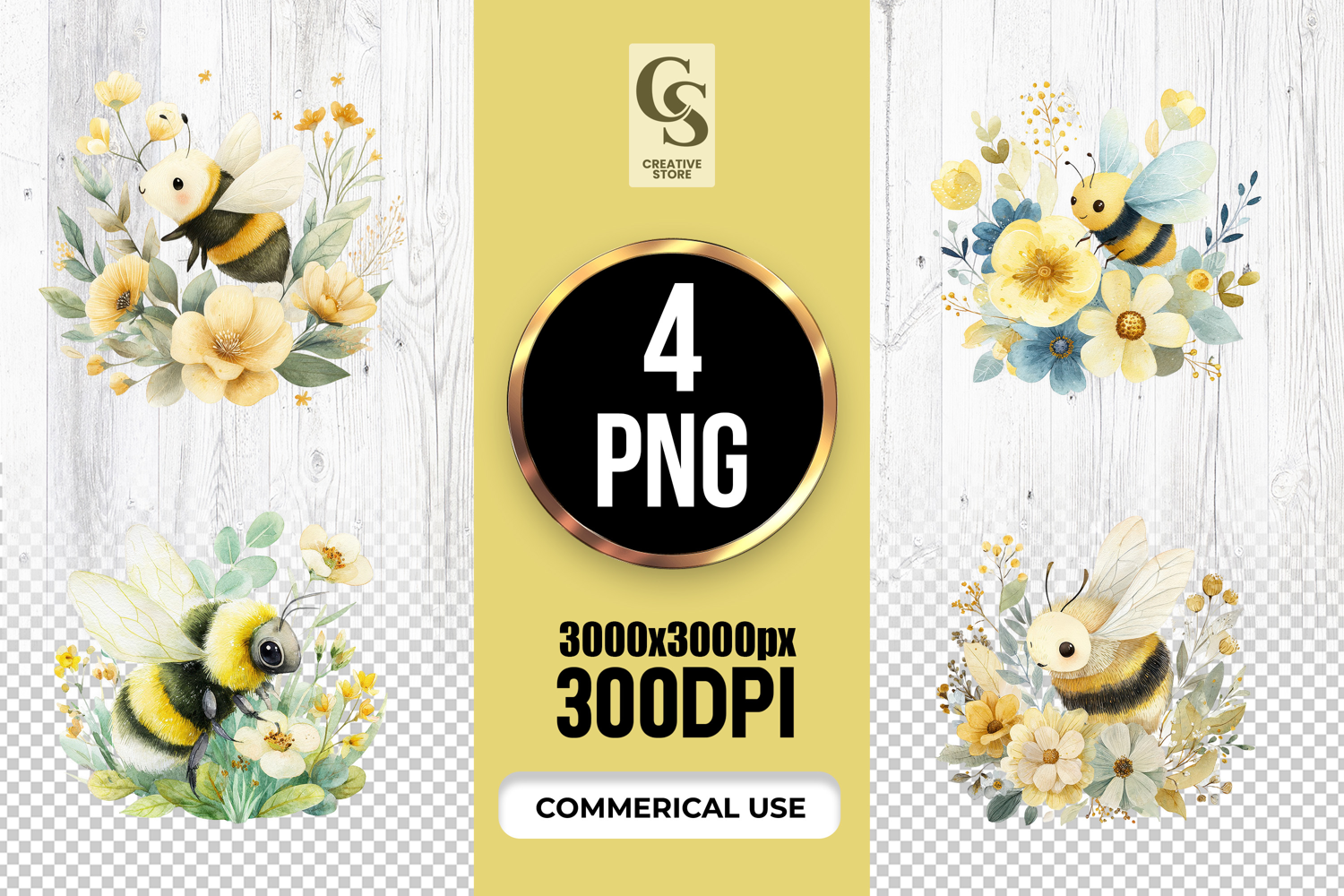 4 Watercolor Bee With Yellow Flowers Clipart Sublimation PNG  Files Perfect for Greeting Cards, Invitations, Junk Journal, Party Decor, Scrapbooking and many other craft projects.
