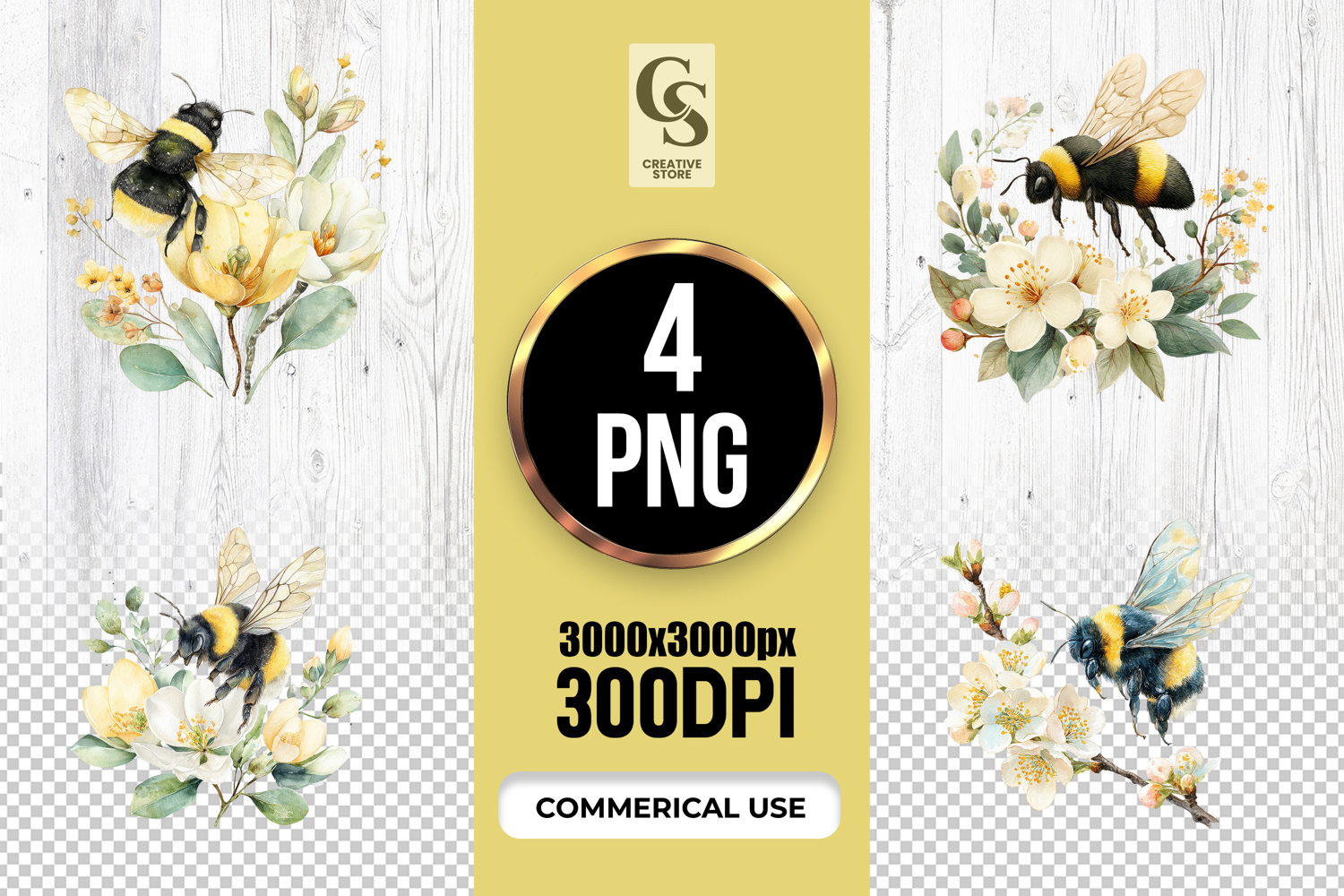 4 Watercolor Bee On Flowers Clipart Sublimation PNG  Files Perfect for Greeting Cards, Invitations, Junk Journal, Party Decor, Scrapbooking and many other craft projects.