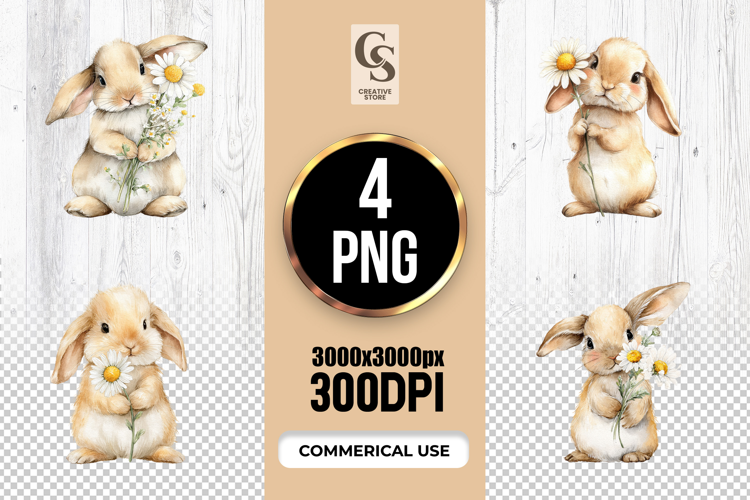 4 Watercolor Bunny With Daisy Flowers Clipart Sublimation PNG  Files Perfect for Greeting Cards, Invitations, Junk Journal, Party Decor, Scrapbooking and many other craft projects.