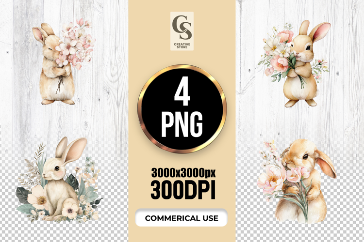 4 Cute Watercolor Bunny With Flowers Clipart Sublimation PNG Files Perfect for Greeting Cards, Invitations, Junk Journal, Party Decor, Scrapbooking and many other craft projects.
