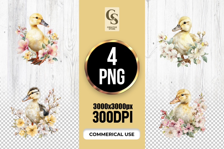 4 Watercolor Duckling With Flowers Clipart Sublimation PNG Files Perfect for Greeting Cards, Invitations, Junk Journal, Party Decor, Scrapbooking and many other craft projects.