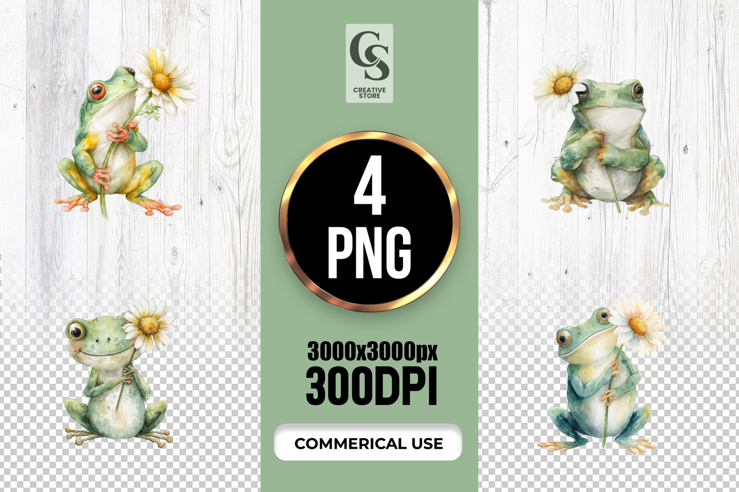 4 Watercolor Frog With Daisy Clipart Sublimation PNG Files Perfect for Greeting Cards, Invitations, Junk Journal, Party Decor, Scrapbooking and many other craft projects.