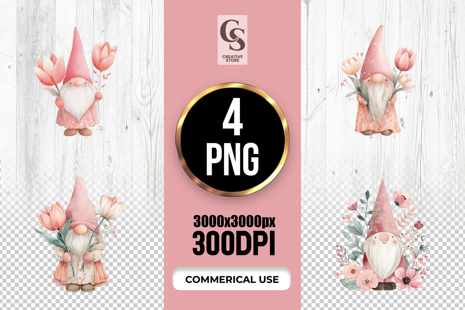 4 Pink Tulip Gnome Watercolor Clipart Sublimation PNG Files Perfect for Greeting Cards, Invitations, Junk Journal, Party Decor, Scrapbooking and many other craft projects.