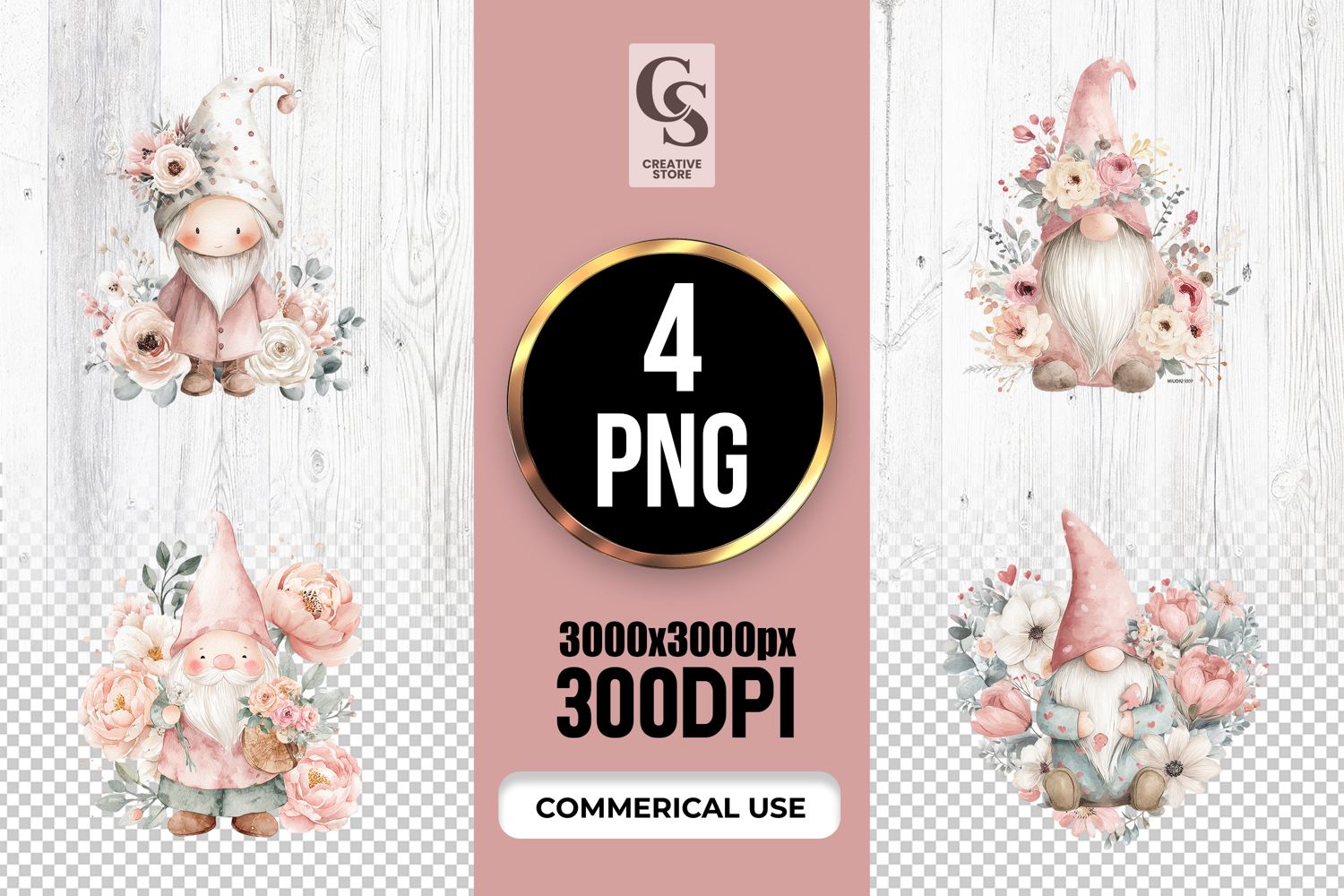 4 Floral Gnome Watercolor Clipart PNG Files Perfect for Greeting Cards, Invitations, Junk Journal, Party Decor, Scrapbooking and many other craft projects.