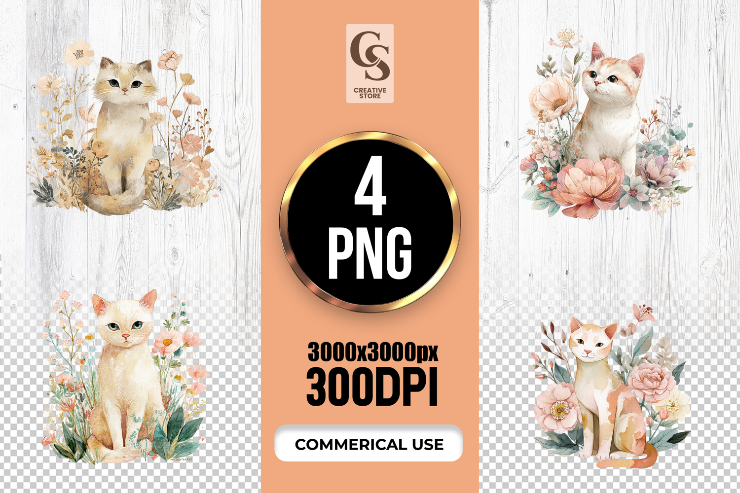 4 Watercolor Floral Cat Clipart PNG Files Perfect for Greeting Cards, Invitations, Junk Journal, Party Decor, Scrapbooking and many other craft projects.