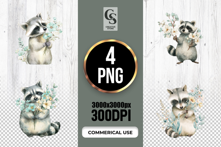 4 Blue Floral Raccoon Watercolor Clipart Sublimation PNG Files Perfect for Greeting Cards, Invitations, Junk Journal, Party Decor, Scrapbooking and many other craft projects.
