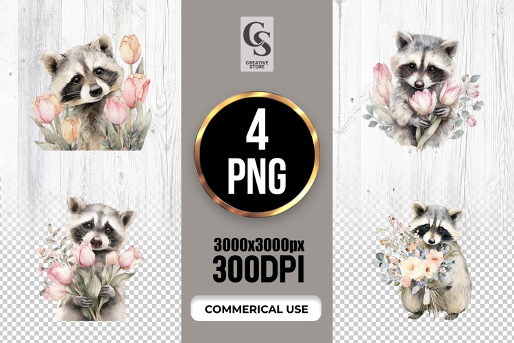 4 Floral Tulip Raccoon Watercolor Clipart Sublimation PNG Files Perfect for Greeting Cards, Invitations, Junk Journal, Party Decor, Scrapbooking and many other craft projects.
