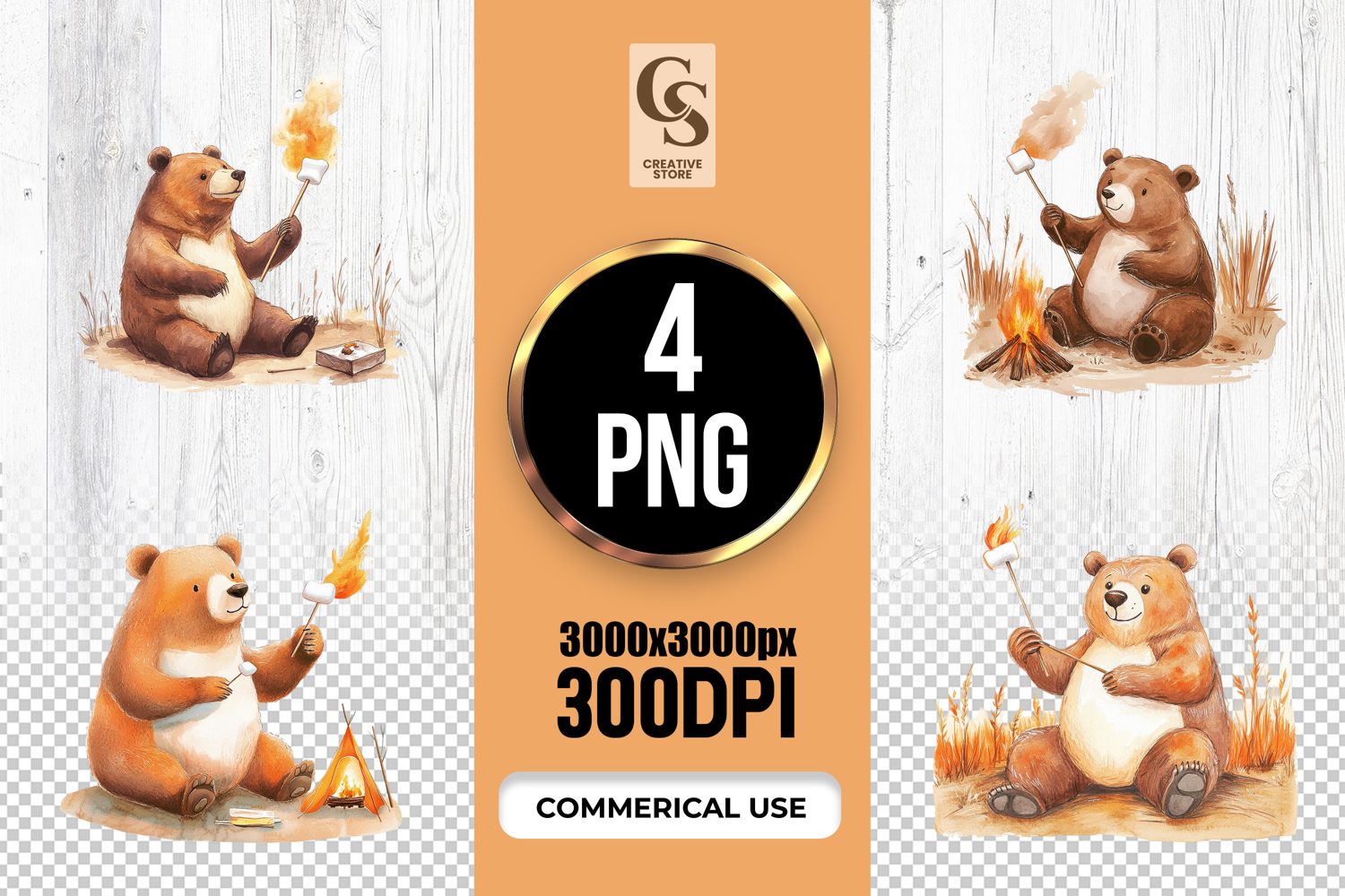 4 Watercolor Campfire Bear Clipart Sublimation PNG Files Perfect for Greeting Cards, Invitations, Junk Journal, Party Decor, Scrapbooking and many other craft projects.