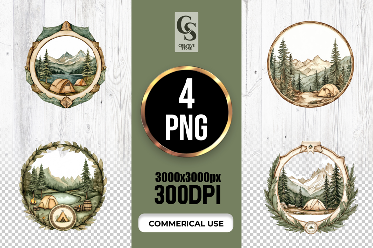 4 Mountain Camping Badge Clipart Sublimation PNG Files Perfect for Greeting Cards, Invitations, Junk Journal, Party Decor, Scrapbooking and many other craft projects.