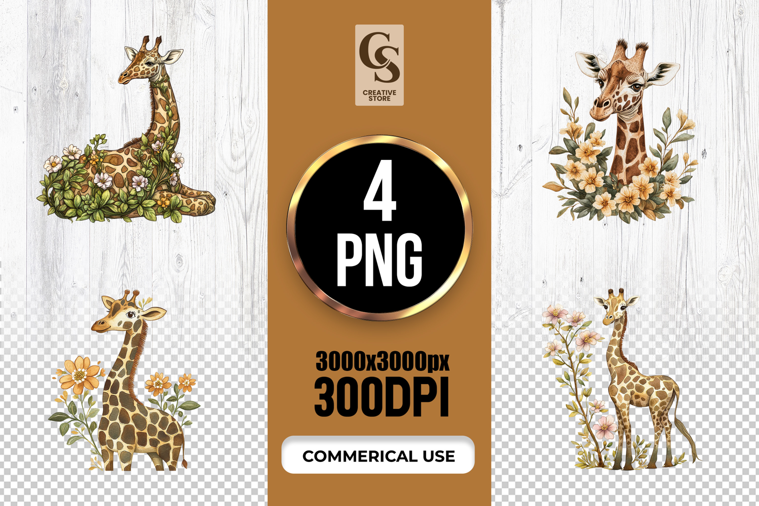 4 Watercolor Giraffe Clipart Sublimation PNG Files Perfect for Greeting Cards, Invitations, Junk Journal, Party Decor, Scrapbooking and many other craft projects.