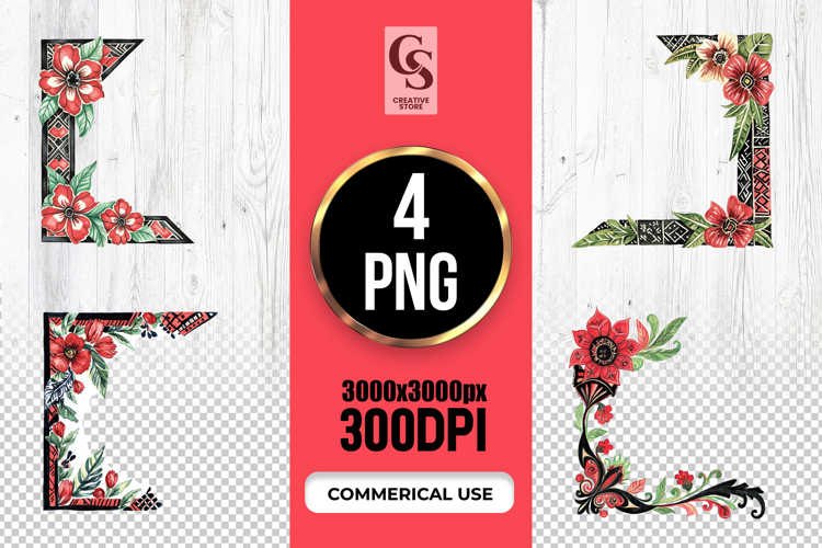 4 Watercolor Floral Corner Frame Clipart PNG Files Perfect for Greeting Cards, Invitations, Junk Journal, Party Decor, Scrapbooking and many other craft projects.