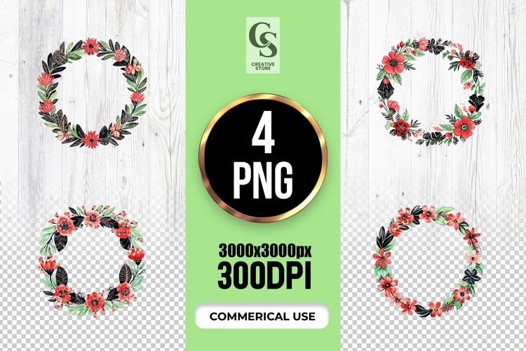 4 Red Black Floral Wreath Frame Clipart Sublimation PNG Files Perfect for Greeting Cards, Invitations, Junk Journal, Party Decor, Scrapbooking and many other craft projects.