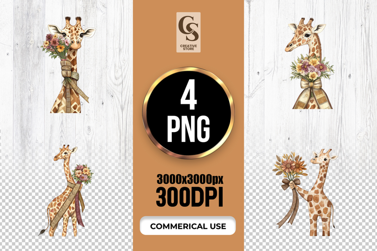 4 Giraffe With Flowers Watercolor Clipart Sublimation PNG Files Perfect for Greeting Cards, Invitations, Junk Journal, Party Decor, Scrapbooking and many other craft projects.