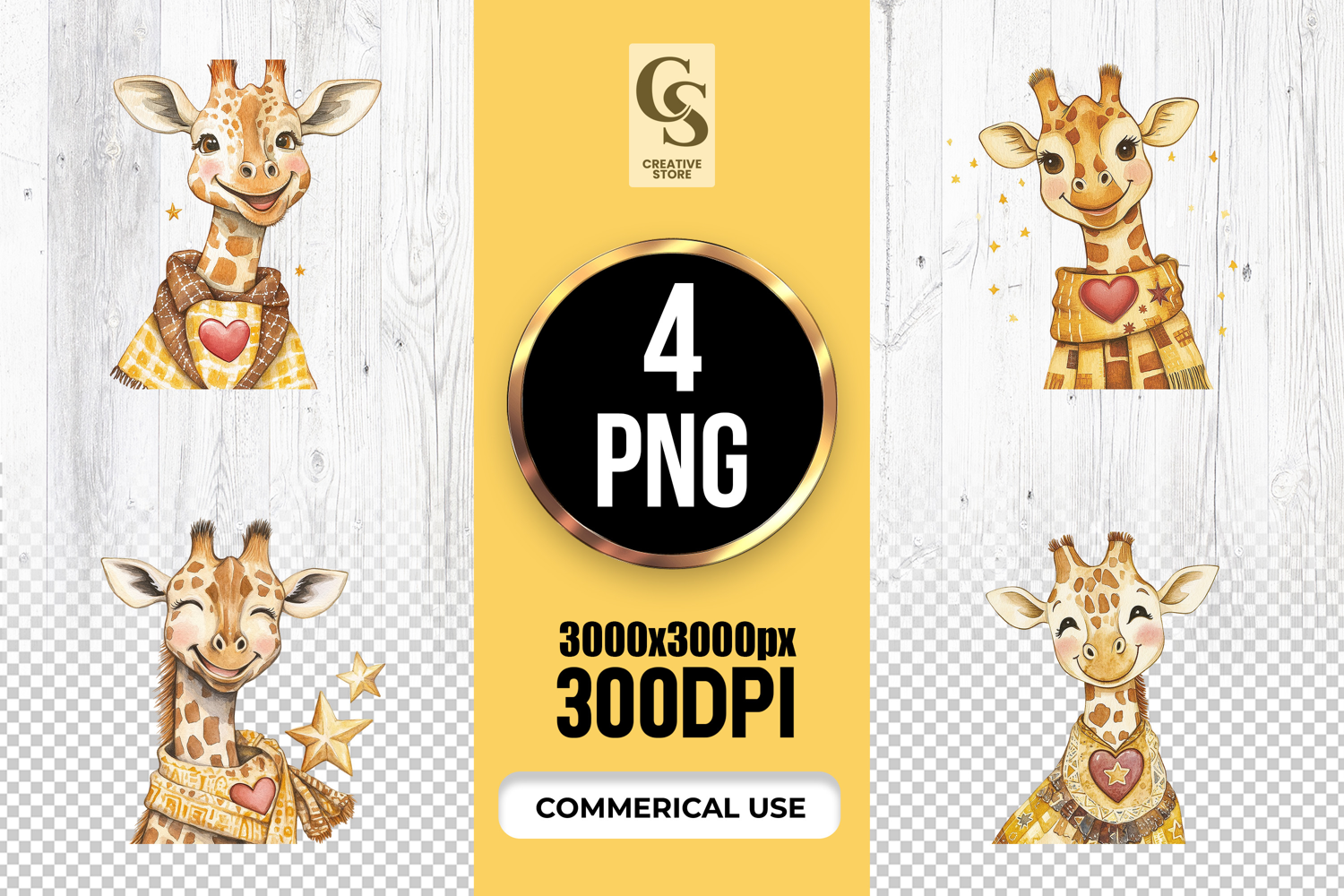 4 Cute Giraffe Watercolor Illustration Clipart Sublimation PNG Files Perfect for Greeting Cards, Invitations, Junk Journal, Party Decor, Scrapbooking and many other craft projects.