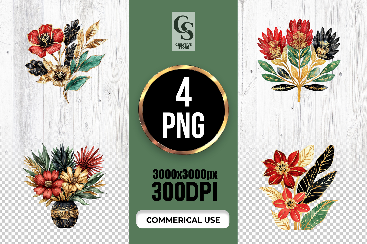 4 Red Black Gold Floral Bouquet Clipart Sublimation PNG Files Perfect for Greeting Cards, Invitations, Junk Journal, Party Decor, Scrapbooking and many other craft projects.