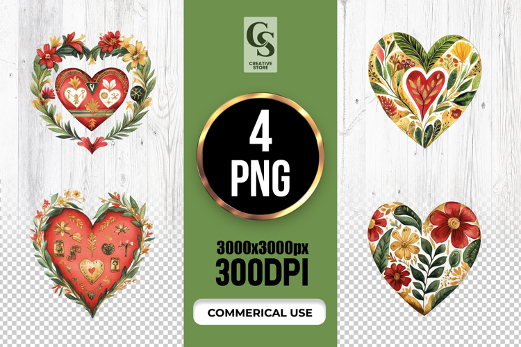 4 Folk Art Floral Heart Clipart Sublimation PNG Files Perfect for Greeting Cards, Invitations, Junk Journal, Party Decor, Scrapbooking and many other craft projects.