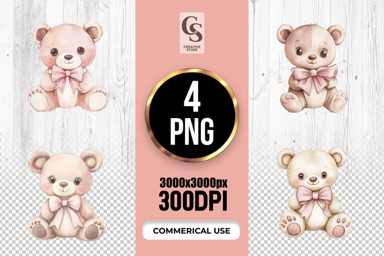 4 Cute Teddy Bear With Bow Clipart Sublimation PNG Files Perfect for Greeting Cards, Invitations, Junk Journal, Party Decor, Scrapbooking and many other craft projects.