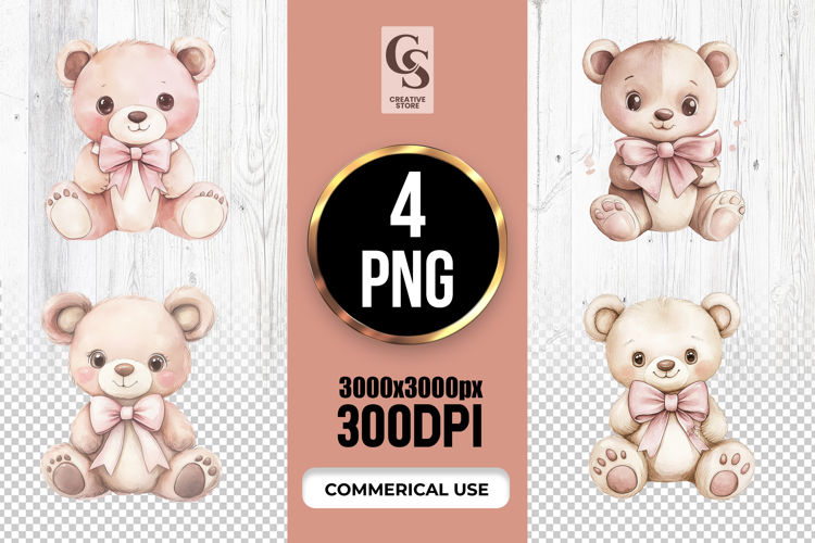 4 Cute Teddy Bear with Bow Clipart Sublimation PNG Files Perfect for Greeting Cards, Invitations, Junk Journal, Party Decor, Scrapbooking and many other craft projects.