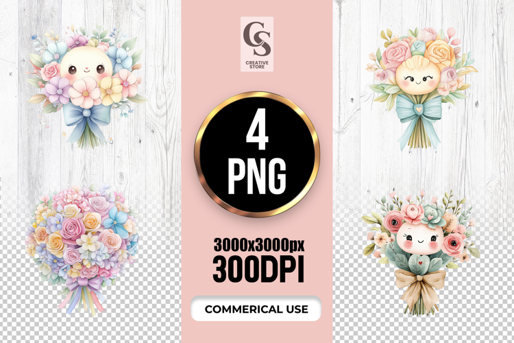4 Cute Kawaii Flower Bouquet Watercolor Clipart PNG Files Perfect for Greeting Cards, Invitations, Junk Journal, Party Decor, Scrapbooking and many other craft projects.