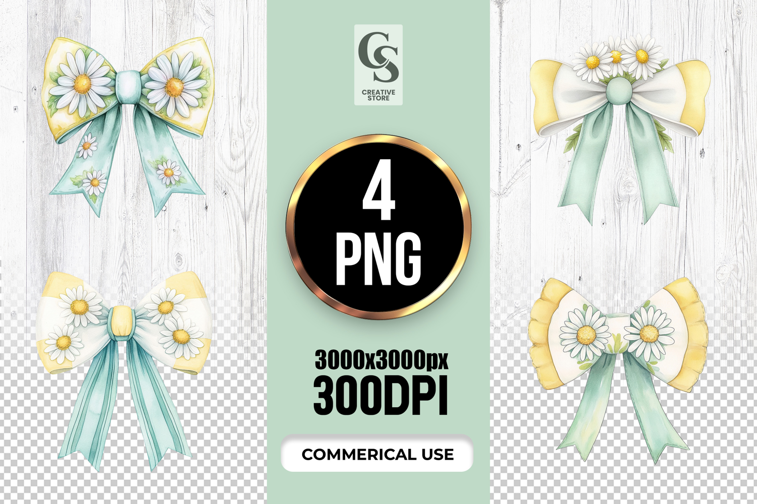 4 Daisy Floral Bow Watercolor Clipart Sublimation PNG Files Perfect for Greeting Cards, Invitations, Junk Journal, Party Decor, Scrapbooking and many other craft projects.