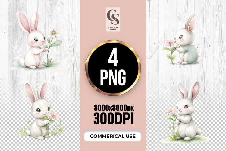 4 Cute Bunny with Flowers Watercolor Clipart Sublimation PNG Files Perfect for Greeting Cards, Invitations, Junk Journal, Party Decor, Scrapbooking and many other craft projects.