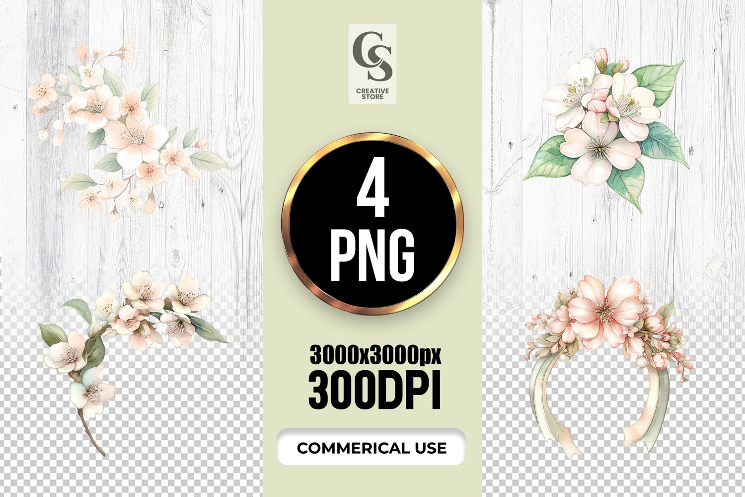4 Cherry Blossom Flowers Watercolor Clipart Sublimation PNG Files Perfect for Greeting Cards, Invitations, Junk Journal, Party Decor, Scrapbooking and many other craft projects.