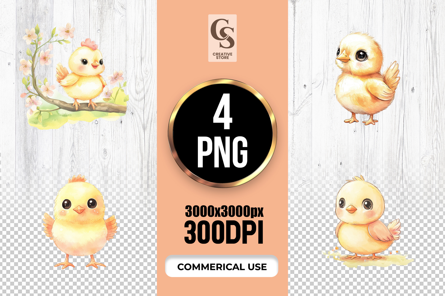 4 Cute Baby Chick Watercolor Clipart Sublimation PNG Files Perfect for Greeting Cards, Invitations, Junk Journal, Party Decor, Scrapbooking and many other craft projects.