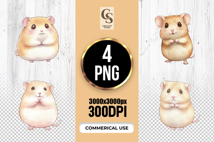 4 Cute Hamster Watercolor Clipart Sublimation PNG Files Perfect for Greeting Cards, Invitations, Junk Journal, Party Decor, Scrapbooking and many other craft projects.