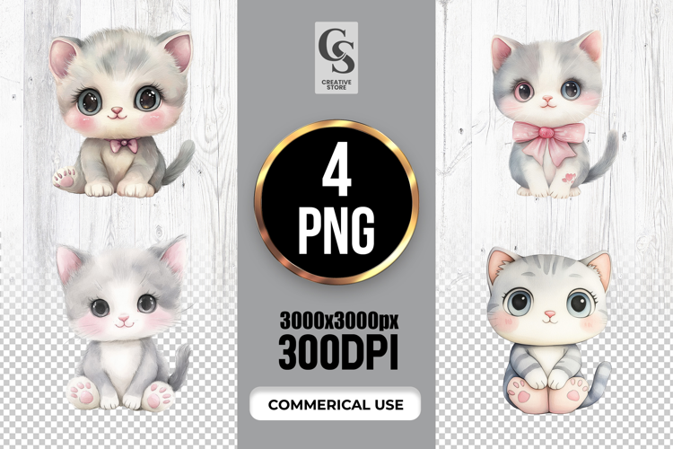 4 Cute Kitten Watercolor Clipart Sublimation PNG Files Perfect for Greeting Cards, Invitations, Junk Journal, Party Decor, Scrapbooking and many other craft projects.