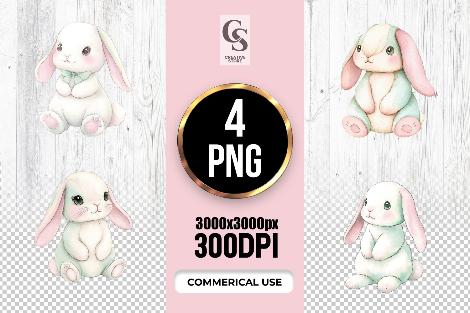 4 Cute Bunny Watercolor Clipart Sublimation PNG Files Perfect for Greeting Cards, Invitations, Junk Journal, Party Decor, Scrapbooking and many other craft projects.