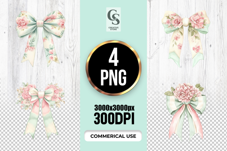 4 Watercolor Floral Bow Clipart Sublimation PNG Files Perfect for Greeting Cards, Invitations, Junk Journal, Party Decor, Scrapbooking and many other craft projects.